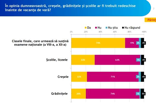 Unul din trei părinţi consideră că ar fi trebuit deschise şcolile şi liceele înainte de vacanţa de vară pentru clasele finale, care urmează să susţină examene naţionale.