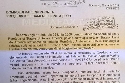 Aceste informaţii sunt cuprinse într-o scrisoare transmisă de către preşedintele Traian Băsescu în 27 martie Parlamentului. Şeful statului informează Legislativul că, în baza legii 291/2007 privind forţele armate străine de pe teritoriul României, a aprobat propunerile premierului referitoare la solicitările părţii americane.