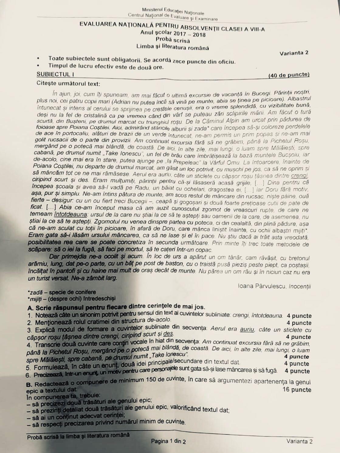 Primul subiect este notat cu 40 de puncte, iar cel de al doilea cu 36 de puncte. Elevii vor mai primi 14 punte pentru redactarea întregii lucrări şi alte 10 puncte din oficiu.
