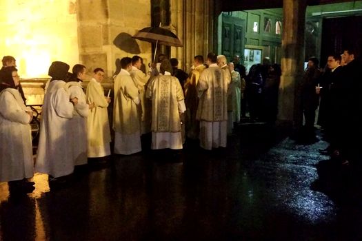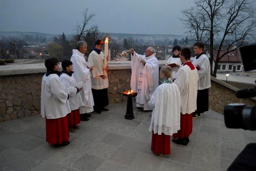 Sute de credincioşi romano-catolici de etnie maghiară din Cluj-Napoca au participat, sâmbătă seara, la slujba de sfinţire a focului care a avut loc în faţa Bisericii „Sf. Mihail” din centrul municipiului, de unde au luat lumină. Aceştia s-au adunat, sâmbătă seara, în jurul orei 20, în faţa lăcaşului de cult, unde mai mulţi preoţi au aprins un foc, de la care s-a împărţit lumina, după care toţi cei prezenţi au intrat în biserică, pentru a asista la slujba de Înviere oficiată de preotul paroh Kovacs Sandor. La finalul slujbei, credincioşii au ieşit cu lumânări aprinse în mâini şi au înconjurat, o singură dată, într-o procesiune, biserica.