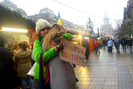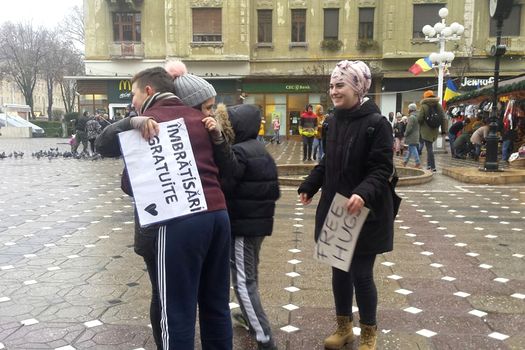 Aproximativ 30 de voluntari, printre care şi copii de cinci sau nouă ani, au participat la campania desfăşurată, duminică, în centrul Timişoarei, după ce au aflat de pe o reţea de socializare că pot oferi îmbrăţişări gratuite.