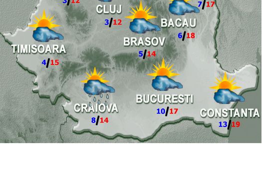 Cerul va avea innorări si pe parcursul zilei doar pe arii restranse va ploua slab in special in regiunile extracarpatice si la munte, iar seara si noaptea, ploile se vor semnala indeosebi in jumătatea de vest a teritoriului. Pe crestele montane inalte, precipitatiile pot fi si sub formă de lapovită. Cantitătile de apă vor depăsi local 10…15 l/mp si cu totul izolat 20 l/mp, indeosebi in nord-vest, dar si in zona Carpatilor Occidentali si in masivele din vestul Carpatilor Meridionali. Vantul va sufla moderat, cu intensificări locale mai ales in Banat si la munte. Temperaturile maxime se vor incadra intre 8 si 17 grade, iar cele minime intre 4 si 12 grade.