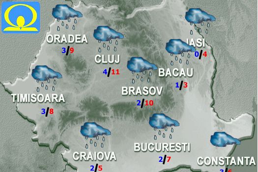 Temperaturile maxime vor fi cuprinse între 3 şi 12 grade, iar cele minime între -2 şi 5 grade. Cerul va prezenta înnorări în toată ţara şi temporar va ploua slab, ziua pe arii relativ extinse, iar noaptea cu precădere în jumătatea de nord. La munte, iar în timpul nopţii, trecător, şi în Moldova, precipitaţiile vor fi şi sub formă de lapoviţă şi ninsoare. Vântul va sufla slab şi moderat, cu intensificări izolate, îndeosebi în zona montană.