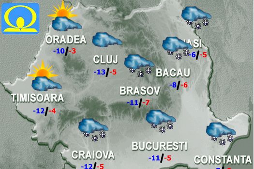 În cursul zilei cerul va fi mai mult noros şi va ninge în jumătatea de sud-est a teritoriului, iar în Dobrogea, în cea mai mare parte a Moldovei, estul Munteniei, precum şi în Carpaţii de Curbură va fi viscol, rafalele de vânt urmând să atingă 50…60 km/h, iar pe arii restrânse 70…80 km/h. În Dobrogea local se vor menţine depunerile de polei. Intensificări ale vântului vor fi şi în sudul Olteniei şi pe crestele montane, astfel că trecător zăpada va fi spulberată. Noaptea înnorările vor fi temporare şi doar pe arii restrânse vor mai fi ninsori slabe, cu precădere în regiunile estice. Temperaturile maxime se vor încadra între -9 şi -1 grad, iar cele minime vor fi cuprinse în general între -16 şi -8 grade. În zonele joase vor fi condiţii de ceaţă asociată cu depunere de chiciură.