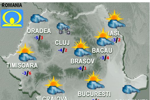 Cerul va avea innorări temporare si doar  pe arii restranse vor fi precipitatii slabe, predominant sub formă de ninsoare, indeosebi in nord, centru si la munte. Vantul va sufla slab si moderat, cu unele intensificări in zona montană inaltă. Temperaturile maxime vor fi cuprinse intre 0 grade in Maramures si nordul Moldovei si 9 grade in Oltenia, iar cele minime se vor situa, in general, intre -8 si 0 grade. In zonele joase, indeosebi noaptea, izolat se va semnala ceată.