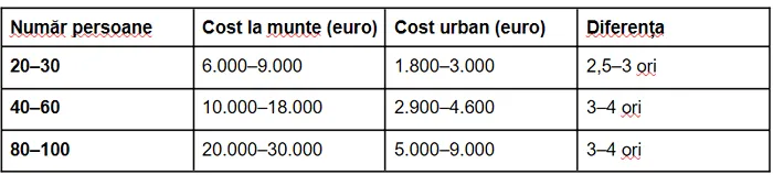 Raportat la numărul de participanți, un teambuilding urban poate coborî costul până la aproximativ 50–100 de euro de persoană, față de 250–300 de euro în cazul variantelor clasice organizate la munte.
