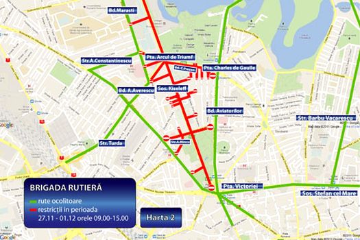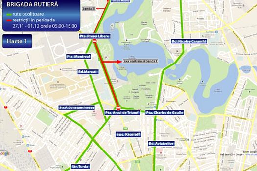 Între orele 5.00 şi 15.00, va fi restricţionată circulaţia pe axul central al Şos. P. Kiseleff şi banda I de circulaţie, pe tronsonul cuprins între Piaţa Presei Libere şi Piaţa Arcului de Triumf, dinspre Piaţa Presei Libere către Piaţa Arcul de Triumf, precum şi banda III de circulaţie pe Şos. Bucureşti – Ploieşti (dinspre Fântâna Mioriţa către Piaţa Presei Libere).