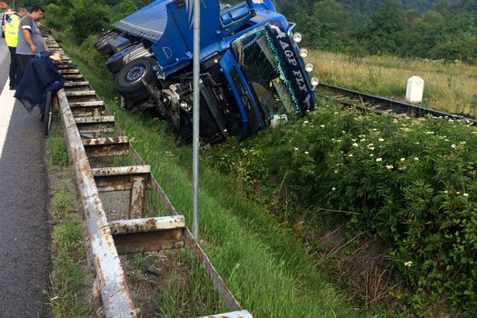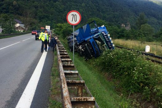Potrivit reprezentanţilor Poliţiei Vâlcea, TIR-ul se deplasa pe sensul de mers Sibiu – Râmnicu Vâlcea, iar la un moment dat a pierdut controlul volanului şi a ieşit de pe drum, răsturnându-se pe calea ferată.