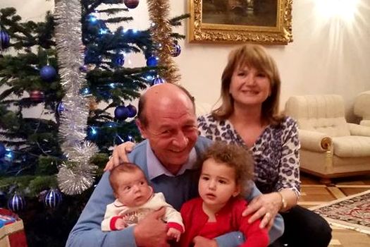 Astfel, într-una dintre imagini, fostul preşedinte apare alături de soţia sa, Maria, ţinându-i în braţe pe cei doi nepoţi, Sofia Anais şi Radu. Sofia Anais este fiica Elenei Băsescu, iar Radu este fiul Ioanei Băsescu, botezat în 20 decembrie la Biserica Sf. Silvestru din Capitală.