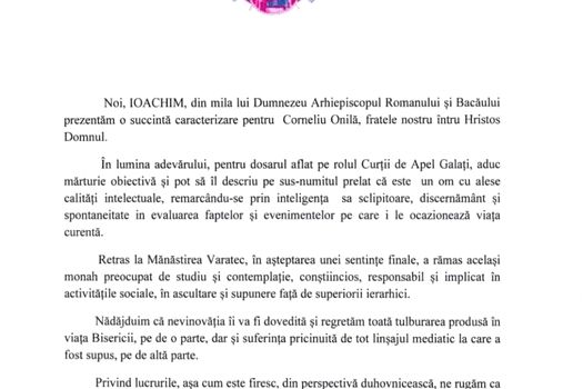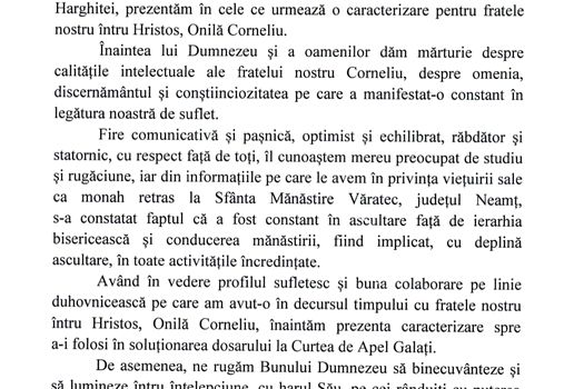 „Având în vedere profilul sufletesc și buna colaborare pe linie duhovnicească pe care am avut-o, în decursul timpului, cu fratele nostru întru Hristos, Onilă Corneliu, înaintăm prezenta caracterizare spre a-i folosi în soluționarea dosarului la Curtea de Apel Galați”, continuă episcopul Covasnei.