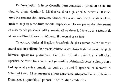 „Acest episcop bun a fost apreciat pentru omenia sa, cum eu însumi îl apreciez, ca membru al Sfântului Sinod. M-aș bucura să-și reia activitatea arhipastorală, spre slava lui Dumnezeu și spre folosul poporului nostru dreptcredincios”, scrie Arhiepiscopul Irineu al Ardealului.