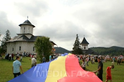 Peste 2.000 de credincioşi din ţară, dar şi din Italia, Germania, Serbia şi Republica Moldova au participat, vineri, la hramul mănăstirii de la Izvorul Mureşului, unde a fost adus şi steagul tricolor lung de 150 de metri şi croit la Chişinău, la iniţiativa tinerilor de la Platforma Civică Acţiunea 2012.