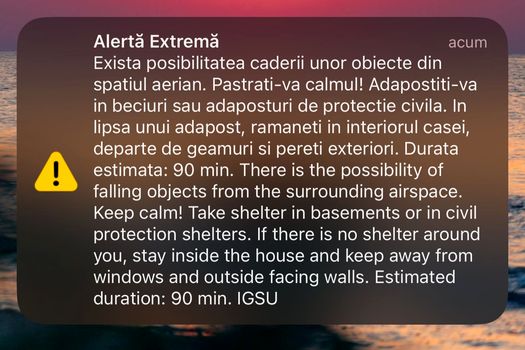 Prima pagină » Social » Alertă în Tulcea. Au fost emise mesaje Ro-Alert despre posibilitatea căderii unor obiecte din spaţiul aerian