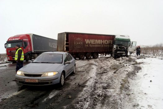 Potrivit Centrului Infotrafic, pe DN2 (E85), la ieşirea din localitatea Dumbrăveni către Râmnicu Sărat, în judeţul Vrancea, a avut loc în jurul orei 07.15 un accident rutier în care au fost implicate două TIR-uri şi un autoturism.