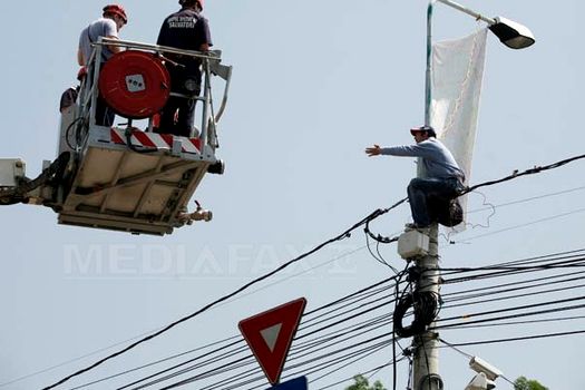 Bărbatul, care acuză justiţia pentru gestul său, s-a legat cu trei cabluri electrice tricolore de stâlp şi de gât.