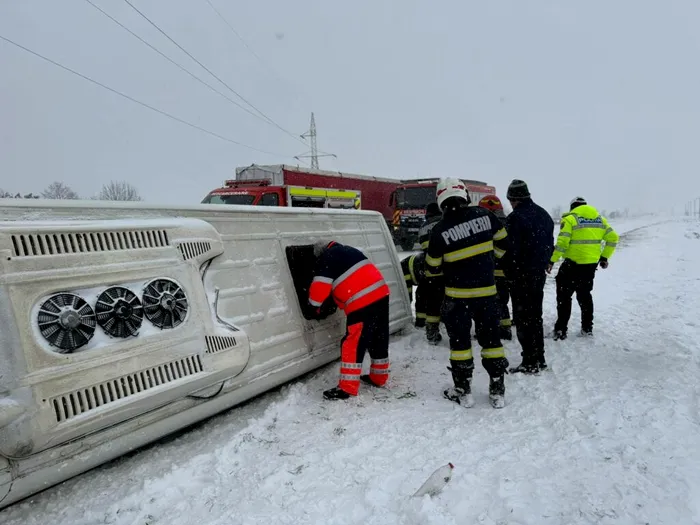 Un microbuz în care se aflau 16 persoane s-a răsturnat sâmbătă dimineața pe DN5, în zona localității Plopșoru, pe sensul de mers spre Giurgiu.