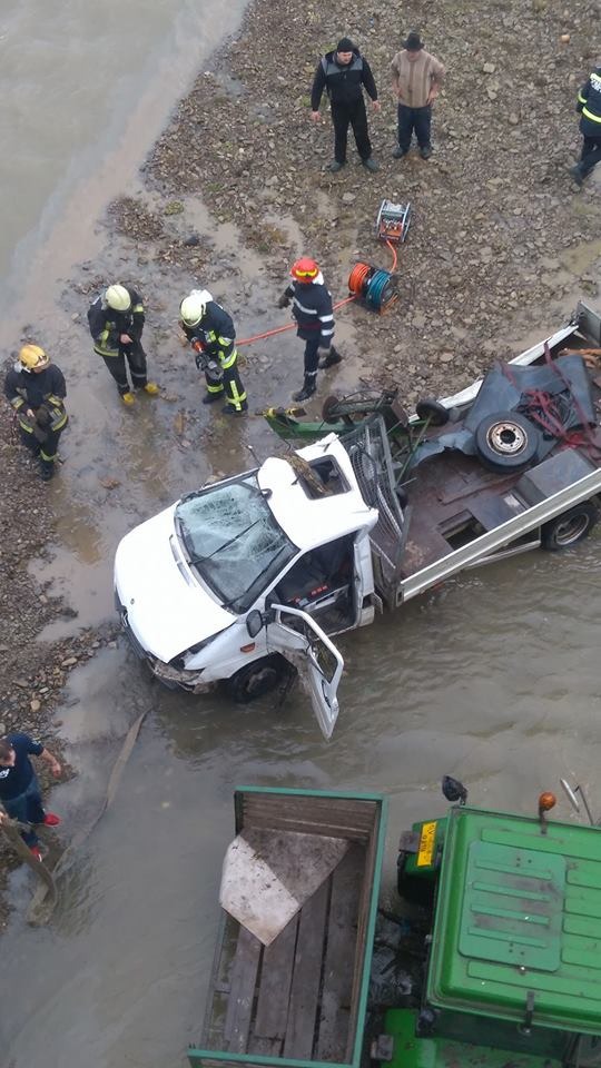 Camioneta a căzut de pe un pod, în apă, de la mai bine de trei metri înăţime şi s-a răsturnat.
