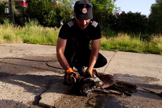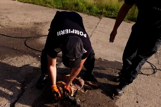 Pompierii Detaşamentului Hunedoara au intrat în baia de ulei industrial şi au recuperat puiul care abia îşi mai ţinea capul la suprafaţă.