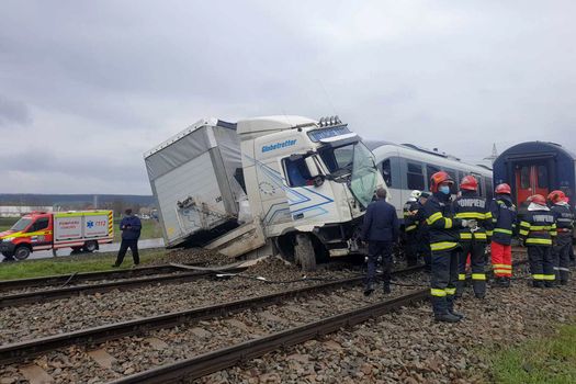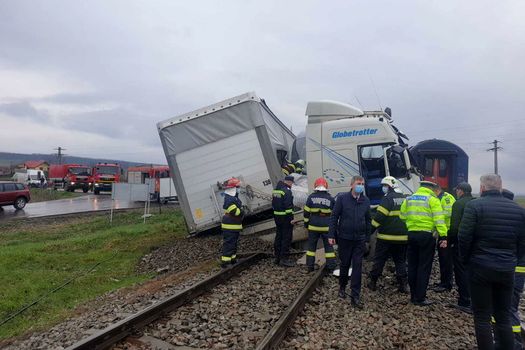 Din primele informaţii, un TIR a fost lovit de două garnituri de tren.