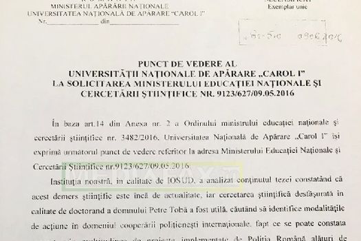 Potrivit adresei transmisă în luna iunie, de către Universitatea de Apărare „Carol I”, ministerului Educaţiei, „instituţia, în callitate de IOSUD (n.r: instituţia organizatoare de studii universitare de doctorat), a analizat conţinutul tezei, constatând că acest demers ştiinţific este încă de actualitate, iar cercetarea ştiinţifică desfăşurată în calitate de doctorand a domnului Petre Tobă a fost utilă, căutând să identifice modalităţile de acţiune în domeniul cooperării poliţieneşti internaţionale, fapt ce se poate constata concret prin multitudinea de proiecte implementate de Poliţia Română alături de organisme internaţionale, privind urmărirea transfrontalieră, schimbul de personal şi de informaţii dar şi dotarea cu tehnică permanentă pentru susţinerea acestor proiecte”.