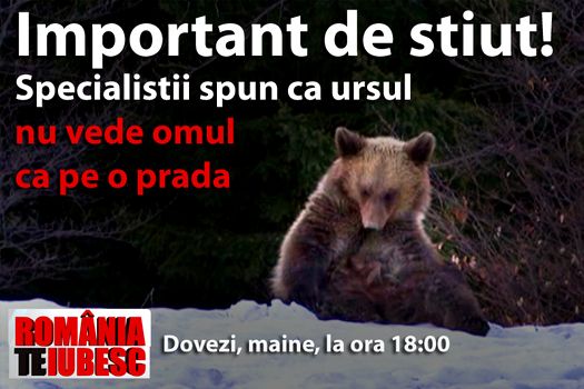 Duminică, într-o nouă ediţie a emisiunii „România, te iubesc!”, Anca Nastasi conduce telespectatorii Pro TV până în bârlogul ursului, într-un demers jurnalistic în care încearcă să răspundă la următoarele întrebări: Reprezintă urşii un pericol public? Cine e vinovat pentru accidentele grave care s-au întâmplat de la Revoluţie încoace? Reuşeşte România să protejeze ursul? Cum îşi protejează exemplarele vest-europenii?