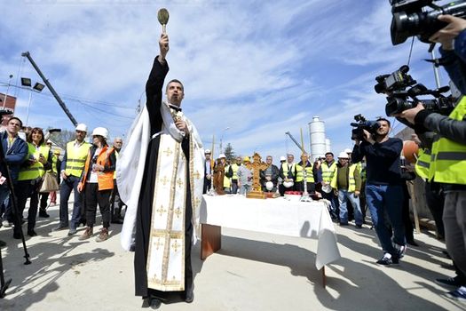 Pe o măsuţă aşezată mai sus de cel unde va lucra „cârtiţa cu motor”, cum îi mai zic în glumă unii muncitori, erau aşezate lumânări, o cruce, Sfânta Evanghelie, un coş cu ouă roşii şi cristelniţa cu apa ce urma să fie sfinţită.