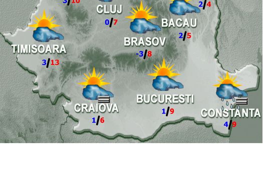 Cerul va avea înnorări, cu precădere în prima parte a zilei şi noaptea, în sudul şi estul ţării şi va fi temporar noros în restul teritoriului. În zonele joase, local va fi ceaţă, posibil asociată cu burniţă, iar în regiunile din extremitatea de nord şi nord-est, trecător şi izolat, va ploua slab. Vântul va sufla slab până la moderat. Temperaturile maxime vor fi cuprinse, în general, între 4 şi 14 grade, iar cele minime se vor încadra între -8 grade în depresiunile Carpaţilor Orientali şi 7 grade în Dealurile de Vest.