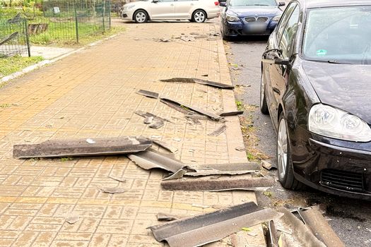 În municipiul Botoșani, pe strada Calea Națională, mai multe elemente de construcție desprinse din acoperișul unui bloc au căzut peste două autoturisme, pe partea carosabilă și pe trotuare.