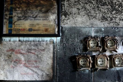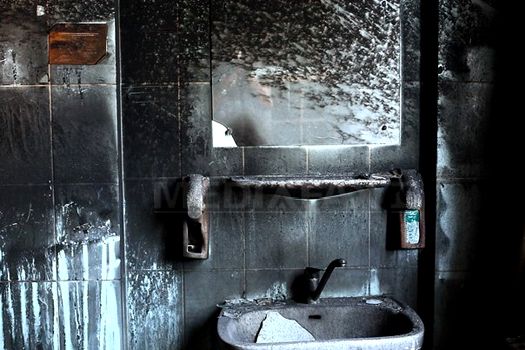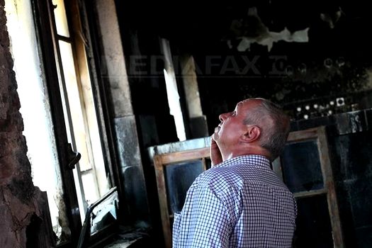 Încăperea este neagră din cauza funinginii produse de incendiu.