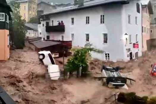 În videoclipul de mai jos se vede cum, în Hallein, Austria, un cuplu nu poate rezista curentului puternic şi ajunge să fie măturat de torent.