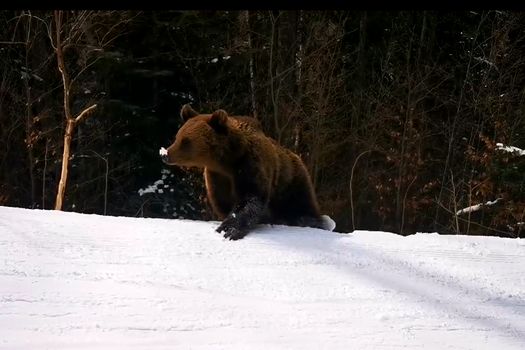 Pentru că ursul, deşi prietenos, parcă nu mai voia să se despartă de turişti, schiorul care filmează îi distrage atenţia şi porneşte în josul pârtiei, ca să-l ademenească. „Hai să facem un concurs. Ia-te după mine!” Jucăuş, animalul porneşte în urmărirea bărbatului, dar nu ţine pasul cu acesta. „Eşti un zăpăcit! Eu zic să te duci în pădure”, îi strigă turistul peste umăr.