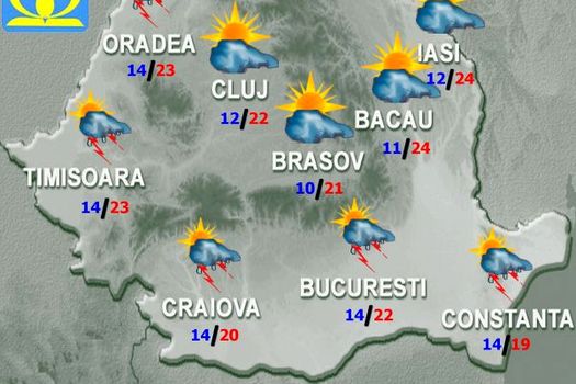 Izolat cantităţile de apă vor depăşi 20…25 l/mp, îndeosebi în Moldova şi la munte. Vântul va sufla moderat cu intensificări locale în cursul zilei, apoi va slăbi în intensitate. Temperaturile maxime, în scădere în regiunile nordice, se vor încadra între 14 grade în estul Transilvaniei şi 26 de grade în Muntenia, iar cele minime vor fi cuprinse între 4 şi 15 grade.