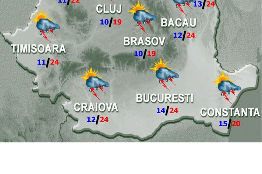 Ploile vor avea si caracter torential si in intervale scurte de timp sau prin cumulare se vor inregistra local cantităti de apă de 15…20 l/mp, iar punctiform peste 25 l/mp. Vor fi conditii de grindină. Temperaturile maxime se vor incadra intre 17 si 26 de grade, iar cele minime intre 8 si 17 grade.