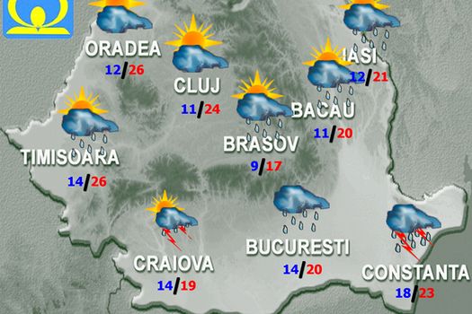 Vremea va fi instabilă, iar valorile termice diurne sub cele normale pentru această dată. În regiunile sudice, sud-vestice, estice şi centrale, dar şi în zonele de munte vor fi înnorări şi temporar se vor semnala averse, însoţite trecător de descărcări electrice şi unele intensificări ale vântului. Izolat cantităţile de apă vor fi mai însemnate şi vor fi condiţii de grindină. În nord-vestul teritoriului cerul va fi temporar noros şi astfel de fenomene vor apărea izolat. Temperaturile maxime vor fi cuprinse între 20 şi 26 de grade, iar cele minime între 9 şi 18 grade.