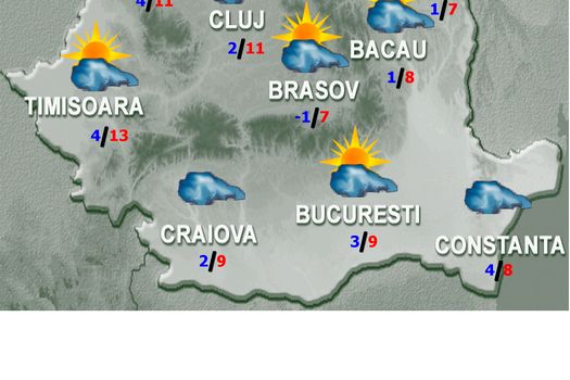 În majoritatea regiunilor, dar cu precădere în cele sudice şi sud-estice valorile termice vor marca o creştere şi se vor apropia de cele climatologic specifice acestei perioade. Cerul va fi variabil, cu înnorări în vestul, nordul şi centrul ţării unde pe arii restrânse va ploua slab. În zona montană precipitaţiile vor fi mai ales sub formă de lapoviţă şi ninsoare. Vântul va avea intensificări locale în majoritatea regiunilor, iar la munte va sufla tare, viscolind şi spulberând ninsoarea pe creste. Temperaturile maxime se vor încadra între 7 şi 16 grade, iar cele minime între -2 şi 8 grade.