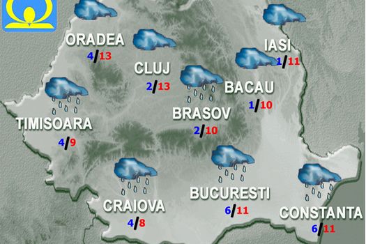 În Oltenia, Muntenia şi în sudul Banatului se vor cumula cantităţi de apă ce vor depăşi local 15…20 l/mp şi izolat 35…40 l/mp, iar vântul va avea intensificări temporare, cu viteze de 50-60 km/h. În Munţii Banatului, în Carpaţii Meridionali şi de Curbură, la altitudini de peste 1700 m, vor predomina ninsorile, iar rafalele vor depăşi 70 km/h. Temperaturile maxime, în scădere în regiunile sudice, se vor încadra între 7 grade în Oltenia şi 15 grade în Maramureş, iar cele minime între -2 şi 7 grade.
