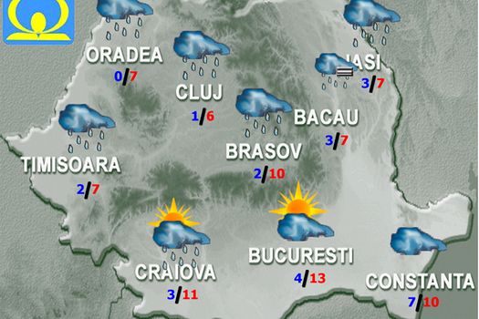 Cerul va avea înnorări şi temporar va ploua, în general slab, pe arii relativ extinse în vestul, centrul şi nordul ţării şi local în rest. La munte şi izolat în Maramureş şi nordul Moldovei, precipitaţiile vor fi şi sub formă de lapoviţă şi ninsoare. Vântul va sufla slab şi moderat, cu unele intensificări în sudul Banatului, Moldova, Bărăgan şi Dobrogea, precum şi pe crestele montane. Temperaturile maxime se vor încadra între 4 şi 15 grade, iar cele minime vor fi cuprinse între -2 şi 7 grade. În zonele joase de relief, cu precădere din sud-estul teritoriului, pe arii restrânse va fi ceaţă.