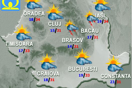 Duminică, vremea se va menţine călduroasă, izolat caniculară în zonele de câmpie, îndeosebi din est şi sud-est. Cerul va fi variabil, cu unele înnorări în regiunile intracarpatice şi la munte unde, cu precădere ziua, pe arii restrânse se vor semnala ploi slabe, de scurtă durată, însoţite de descărcări electrice şi unele intensificări ale vântului. Izolat vor fi condiţii de grindină. Temperaturile maxime vor fi cuprinse între 29 şi 35 de grade, iar cele minime se vor încadra între 14 şi 25 de grade, mai scăzute în depresiuni până la 11 grade.