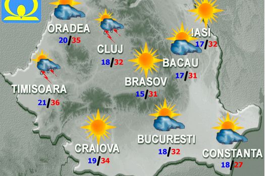Cerul va fi variabil, cu înnorări temporar accentuate în partea a doua a zilei când local în zona de munte şi pe spaţii restrânse în vestul, nord-vestul şi centrul ţării se vor semnala averse, descărcări electrice şi intensificări de scurtă durată ale vântului. Izolat vor fi condiţii de grindină, iar ploile pot avea caracter torenţial. Temperaturile minime se vor încadra între 14 şi 24 de grade.