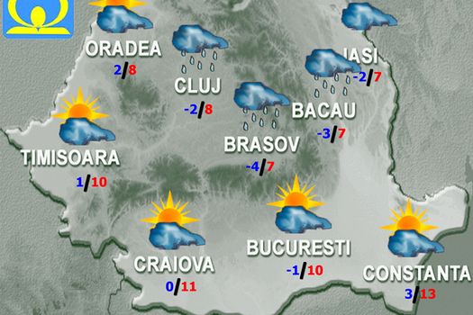 Cerul va fi variabil, cu înnorări temporare şi pe arii restrânse ploi slabe, în special ziua, în nordul, centrul şi estul ţării şi izolat în celelalte regiuni. Pe crestele montane precipitaţiile vor fi sub formă de lapoviţă şi ninsoare. Vântul va sufla slab şi moderat, cu unele intensificări la munte. Temperaturile maxime vor fi cuprinse între 3 şi 13 grade, iar cele minime între -7 şi 5 grade. Izolat vor fi condiţii de ceaţă.