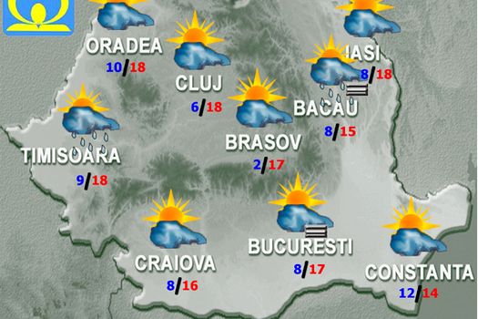 Joi, vremea va fi normală sub aspect termic, în cea mai mare parte a ţării. În nord şi centru vor fi înnorări şi local va ploua, în timp ce în restul teritoriului cerul va deveni variabil, iar ploi slabe, pe arii restrânse, se vor semnala în prima parte a zilei. Vântul va sufla slab şi moderat. Temperaturile maxime vor fi cuprinse între 14 grade în nordul Moldovei şi 21 de grade în sudul Banatului şi în Lunca Dunării, iar cele minime vor fi cuprinse între 4 şi 14 grade, uşor mai coborâte în depresiuni. Îndeosebi noaptea, local în regiunile extracarpatice şi izolat în rest, se va produce ceaţă.