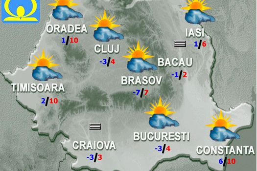 Cerul va fi parţial noros, iar dimineaţa şi noaptea vor fi condiţii de ceaţă. Vântul va sufla în general slab. Temperatura maximă va fi de 3…5 grade, iar cea minimă de -4…-2 grade.