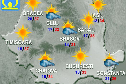 Cerul va fi variabil, mai mult senin dimineaţa şi noaptea, şi doar izolat, în sud-est şi la munte, vor fi ploi de scurtă durată şi, posibil, descărcări electrice. Vântul va sufla slab şi moderat. Temperaturile maxime se vor încadra între 26 de grade pe litoral şi 37 de grade în Câmpia de Vest, iar cele minime între 14 şi 24 de grade, mai coborâte în depresiunile Carpaţilor Orientali până spre 10 grade.