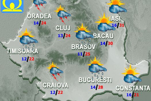 Cantităţile de apă vor depăşi local 15…20 l/mp şi izolat 30…40 l/mp şi vor fi căderi de grindină. În restul teritoriului astfel de fenomene vor apărea pe spaţii mai restrânse. Temperaturile maxime vor fi cuprinse între 20 de grade în Dealurile de Vest, în Oltenia şi pe litoral şi 31 de grade în Moldova, iar cele minime se vor situa între 9 şi 18 grade.