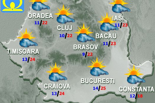 Joi, vremea va fi în general instabilă. Temporar înnorările vor fi accentuate şi, pe arii relativ extinse, vor fi averse, însoţite de descărcări electrice. Local, cu precădere în sud-vestul ţării şi în zonele de deal şi de munte, cantităţile de apă vor mai depăşi 15 – 20 l/mp. Vor fi condiţii de grindină. Vântul va avea intensificări în regiunile sudice, dar trecător şi în restul teritoriului, în principal în timpul averselor. Temperaturile maxime, în scădere faţă de ziua anterioară, se vor încadra între 15 şi 24 de grade, iar cele minime vor fi cuprinse între 6 şi 14 grade.