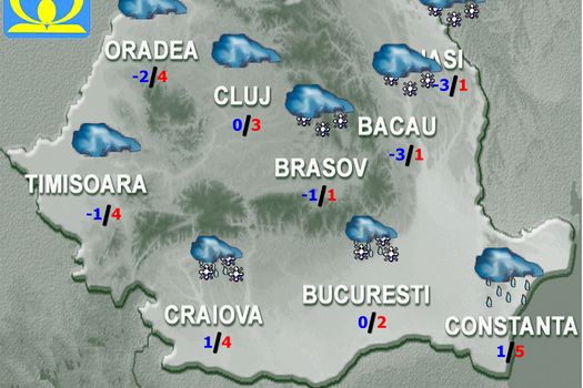 Marţi, vremea va fi în general închisă. Se vor semnala precipitaţii, în general slabe cantitativ, pe arii restrânse ziua, dar în extindere noaptea, cu precădere în regiunile sudice. Acestea vor fi sub formă de ninsoare în jumătatea de nord a ţării şi mixte în rest. Vor fi condiţii de polei. Vântul va sufla slab şi moderat. Temperaturile maxime se vor încadra între -2 şi 5 grade, iar cele minime între -6 şi 1 grad.