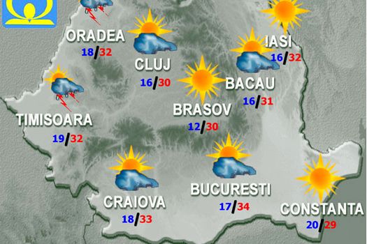 Cerul va fi variabil, cu înnorări temporare în vestul şi nord-vestul ţării, precum şi la munte, unde, mai ales după-amiaza, local vor cădea averse însoţite de descărcări electrice. Izolat vor fi condiţii de grindină. Vântul va sufla slab şi moderat, cu intensificări trecătoare în timpul ploilor. Temperaturile maxime vor fi cuprinse între 27 de grade în Maramureş şi estul Transilvaniei şi 34 de grade în sudul Olteniei şi al Munteniei, iar cele minime se vor situa între 14 şi 22 de grade, mai coborâte în depresiuni, spre 9 grade.