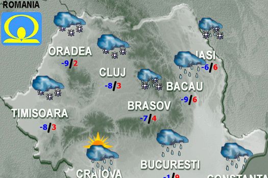 Temperaturile maxime vor fi cuprinse între -1 grad în Dealurile de Vest şi 10 grade în sudul Munteniei şi în Dobrogea, iar cele minime se vor situa în general între -11 şi 0 grade.
