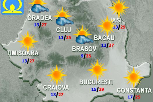 Duminică, vremea va fi în general frumoasă, iar valorile termice se vor menţine apropiate de cele normale pentru această dată. Temperaturile maxime vor fi cuprinse între 23 şi 30 de grade, iar cele minime se vor încadra între 9 şi 20 de grade, mai mici în depresiuni, spre 5 grade. Cerul va fi variabil, cu unele înnorări în vestul, nord-vestul ţării şi la munte, unde cu totul izolat vor fi ploi de scurtă durată, posibil însoţite de descărcări electrice. Vântul va sufla slab şi moderat, cu unele intensificări pe litoral şi în sudul Banatului. Dimineaţa şi noaptea, izolat în zonele joase vor fi condiţii de ceaţă.