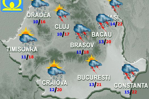 Instabilitatea atmosferică va fi accentuată în jumătatea de nord-est a teritoriului,  precum şi în zonele de deal şi munte, unde vor fi înnorări temporar accentuate, averse, descărcări electrice şi intensificări de scurtă durată ale vântului. Cantităţile de apă vor depăşi local 25…30 l/mp şi izolat 50 l/mp şi vor mai fi posibile căderi de grindină. În restul teritoriului cerul va fi temporar noros, iar astfel de fenomene se vor semnala pe arii restrânse. Temperaturile maxime vor fi de la 13…15 grade în Dealurile de Vest până la 22 de grade în estul extrem, iar cele minime se vor încadra între 7 şi 17 grade.